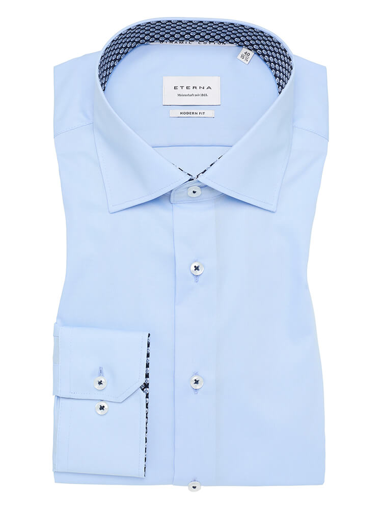 La chemise d'affaires moderne de la collection ETERNA Modern Fit représente l'homme confiant et à la mode d'aujourd'hui. Une coupe contemporaine combinée à des détails de produits de qualité promet un haut niveau de confort, faisant de cette chemise un maître de l'arrangement. La chemise unie pour homme de la couleur bleu clair ne doit manquer dans aucune garde-robe masculine et peut être combiné avec le col classique et distingué Kent pour toute occasion ainsi que dans la vie de tous les jours. Avec une cravate assortie et un nœud large de cravate, on obtient cette chemise pour ETERNA Modern Fit à son meillieur.