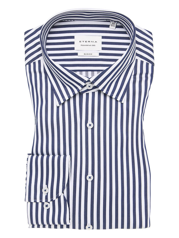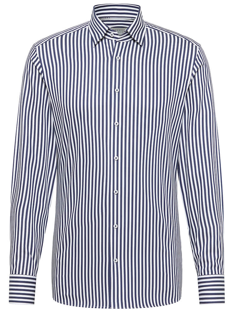 La chemise d'affaires élegante de la collection ETERNA Slim Fit représente l'homme mince et soucieux de la mode d'aujourd'hui. Une coupe moulante associée à des détails mode promettent un haut niveau de confort et font de cette chemise un artiste de la combinaison. La chemise rayée pour homme de la couleur bleu foncé ne doit manquer dans aucune garde-robe masculine et peut être portée avec le col 'élégant et intemporel Boutons sous col pour toute occasion ainsi que dans la vie de tous les jours. C'est avec une cravate étroite et un petit nœud de cravate que cette chemise pour homme ETERNA Slim Fit à son meillieur.