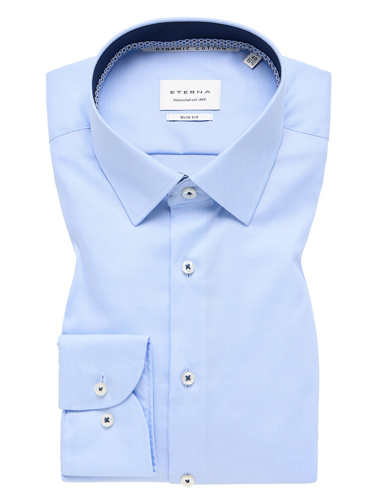 La chemise d'affaires élegante de la collection ETERNA Slim Fit représente l'homme mince et soucieux de la mode d'aujourd'hui. Une coupe moulante associée à des détails mode promettent un haut niveau de confort et font de cette chemise un artiste de la combinaison. La chemise unie pour homme de la couleur bleu clair ne doit manquer dans aucune garde-robe masculine et peut être portée avec le col 'élégant et intemporel Kent pour toute occasion ainsi que dans la vie de tous les jours. C'est avec une cravate étroite et un petit nœud de cravate que cette chemise pour homme ETERNA Slim Fit à son meillieur.