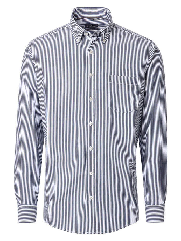 La chemise décontractée moderne de la collection CASAMODA Modern Fit représente l'homme confiant et à la mode d'aujourd'hui. Une coupe contemporaine combinée à des détails de produits de qualité promet un haut niveau de confort, faisant de cette chemise un maître de l'arrangement. La chemise rayée pour homme de la couleur bleu foncé ne doit manquer dans aucune garde-robe masculine et peut être combiné avec le col classique et distingué Pointes boutonnées pour toute occasion ainsi que dans la vie de tous les jours. Avec une cravate assortie et un nœud large de cravate, on obtient cette chemise pour CASAMODA Modern Fit à son meillieur.Informations du fabricant :